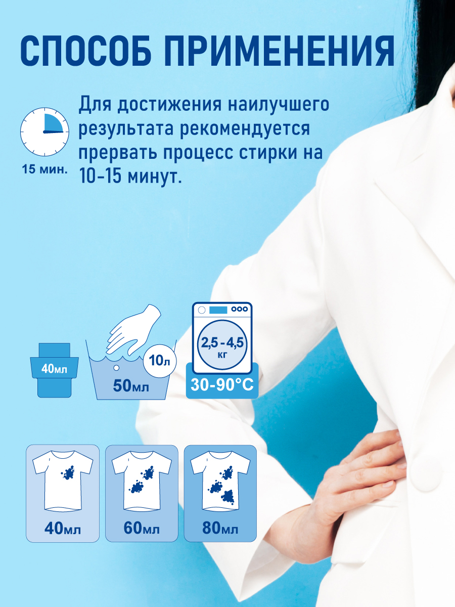 Предназначен для стирки, отбеливания и дезинфекции белого белья и одежды. Его можно использовать как для автоматической, так и ручной стирки. Прекрасно удаляет все виды пятен, придавая свежесть и белоснежную чистоту. Активные компоненты в составе защищают ткань от повреждений, предотвращают образование накипи в стиральных машинах.